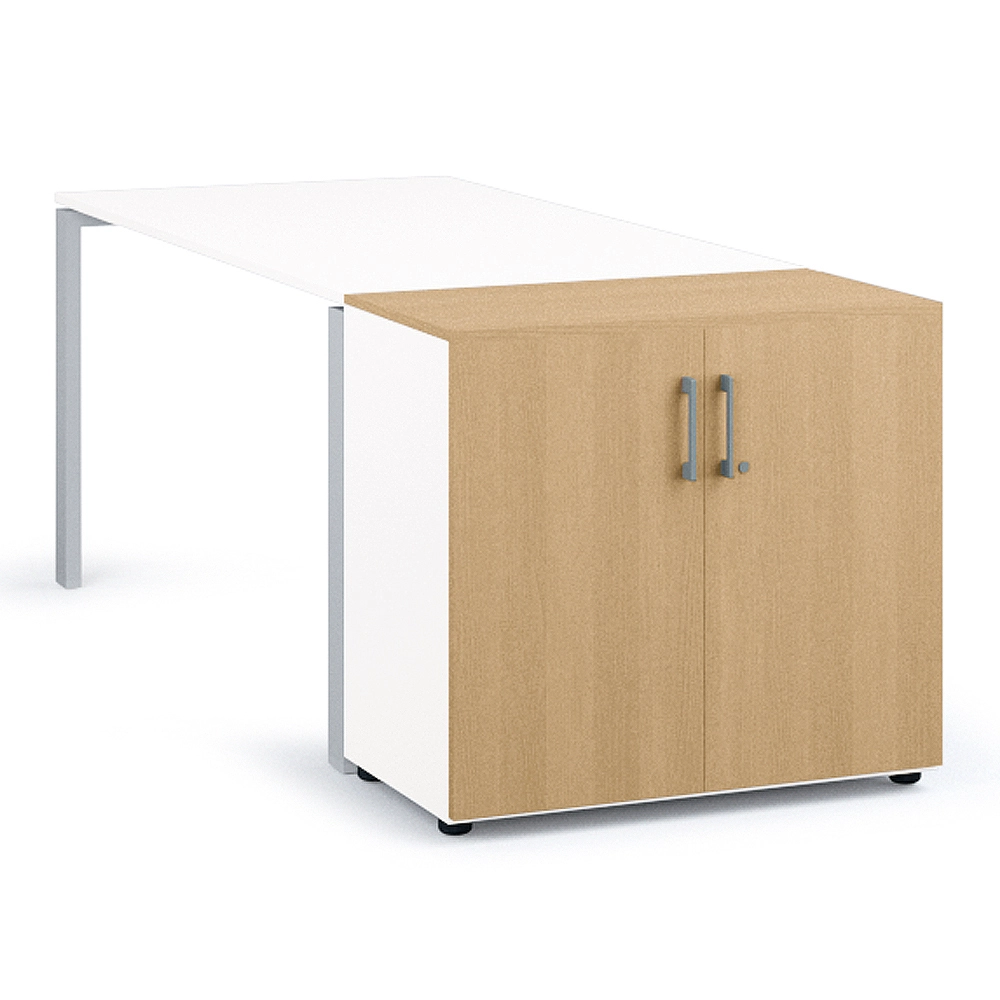 Armadio in melaminico basso con ante dimensione 80x45x74h cm con scocca spessore 18 mm in appoggio su piedi in plastica, retro spessore 8 mm e un ripiano interno spessore 25 mm il tutto disponibile nel colore bianco o grigio e coppia di ante battenti in melaminico spessore 18 mm con maniglie in plastica colore grigio e serratura. Top di finitura superiore in melaminico spessore 18 mm con bordo abs dimensione 80x45 cm.