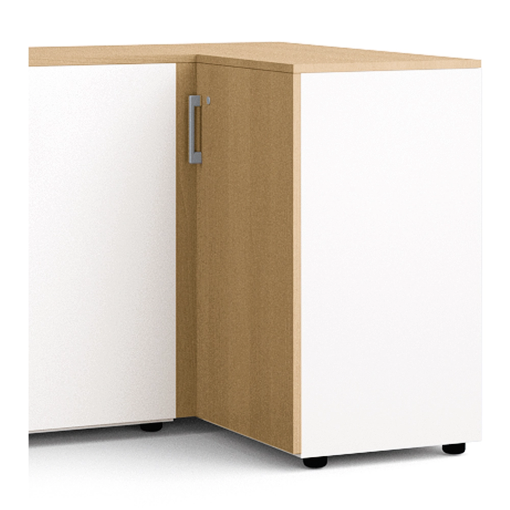 Armadiatura bassa ad angolo in melaminico composta da un contenitore dimensione 90x45x82h cm con struttura in melaminico disponibile colore bianco o grigio, un ripiano interno in melaminco spessore 25 mm in tinta con la struttura, una coppia di ante battenti di cui una sola apribile, un fianco melaminico spessore 40 mm in tinta con la struttura e numero 2 top superiori di finitura.