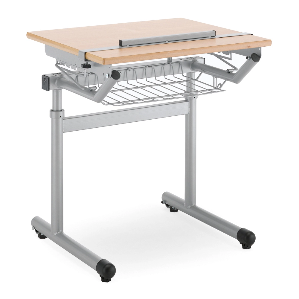 Il banco per ipovedenti è regolabile in altezza tramite manovella estraibile, che consente il perfetto posizionamento del piano. Il piano è inclinabile per mezzo di un pistone bloccabile, che permette un´inclinazione di 75°. Quindi è possibile bloccare il piano a qualsiasi gradazione, consentendo così la perfetta postura di chi deve utilizzare il banco. La rapidità delle regolazioni sia in altezza che inclinazione, permettono di variare anche più volte in un giorno le stesse. Nella parte posteriore sono alloggiate due ruote, che permettono l´agevole spostamento in vari locali. Il piano di lavoro viene fornito con una barra fermalibro regolabile, e un´ comodo portamatite. Struttura portante in tubo di acciaio diam. 45 sp. 2 mm, unione di due montanti con tubo quadro 30x30 sp. 2 mm con funzione di poggiapiedi, tappi inestraibili in ABS con piedini regolabili diam. 40 in moplen per maggiore stabilità su fondi irregolari. Parte superiore in tubo diam. 40 sp. 2 mm. zincocromato per evitare usure.