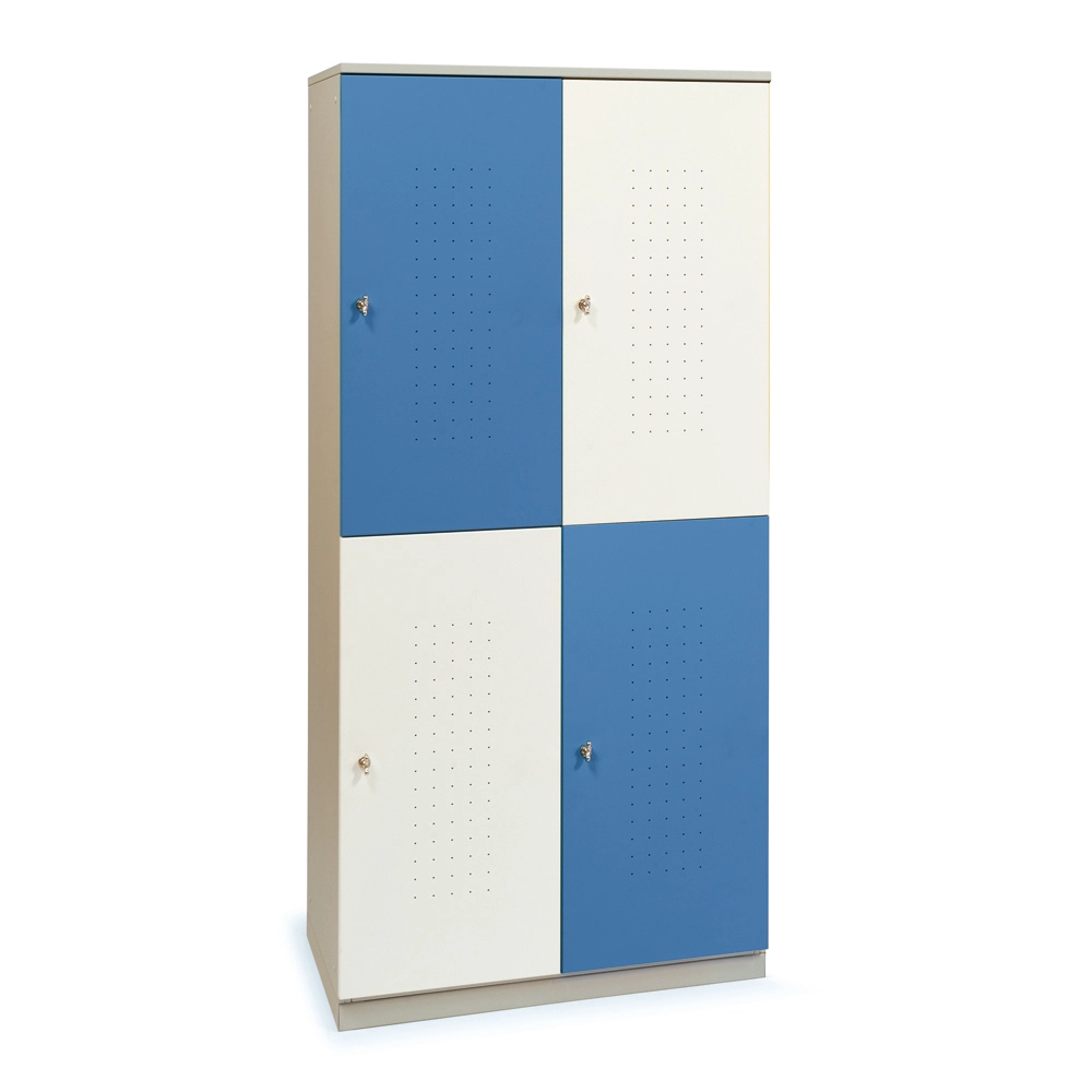 Casellario con struttura metallica,4 ante in metallo. Vani con ripiano e gancio appendiabiti. L80 P47 H176. Il casellario può essere dotato di serratura lucchettabile, a chiave, a combinazione.