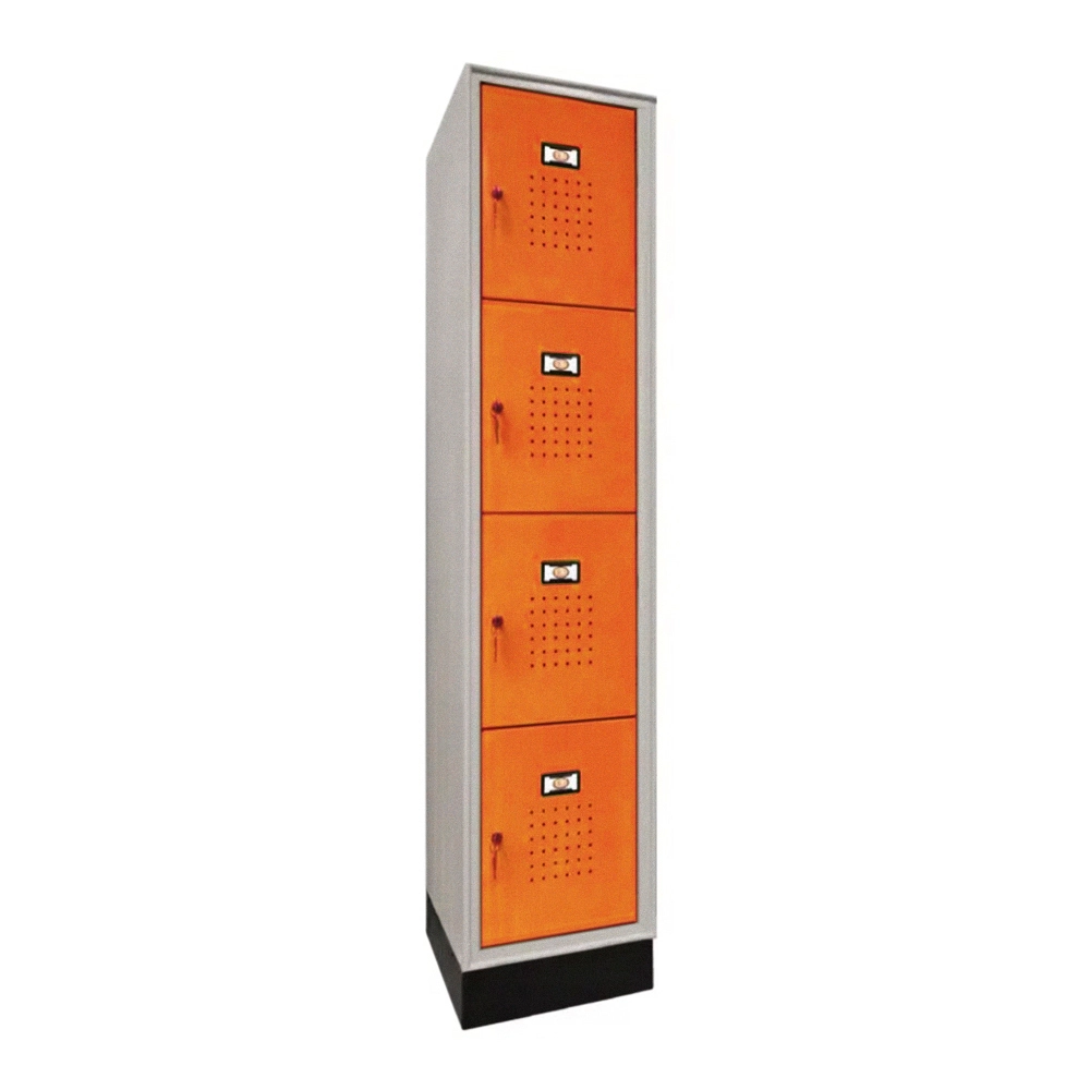 Armadio multi spogliatoio su zoccolo in plastica H 10 cm di colore nero. Armadio spogliatoio monoblocco. Struttura portante realizzata in lamiera d'acciaio profilata spessore 6/10. Ante speciali dotate di n. 2 canottature di rinforzo (1 lato cerniere e 1 lato chiusura) e dotate di fori di aerazione a tutta anta. Cerniere interne speciali antiscasso con perno di rotazione interno invisibile ad anta chiusa. Bordo frontale perimetrale arrotondato anti urto raggio mm 6. Nervature longitudinali su fianchi e porte. Asole sul tetto per consentire un'ottima circolazione dell'aria.