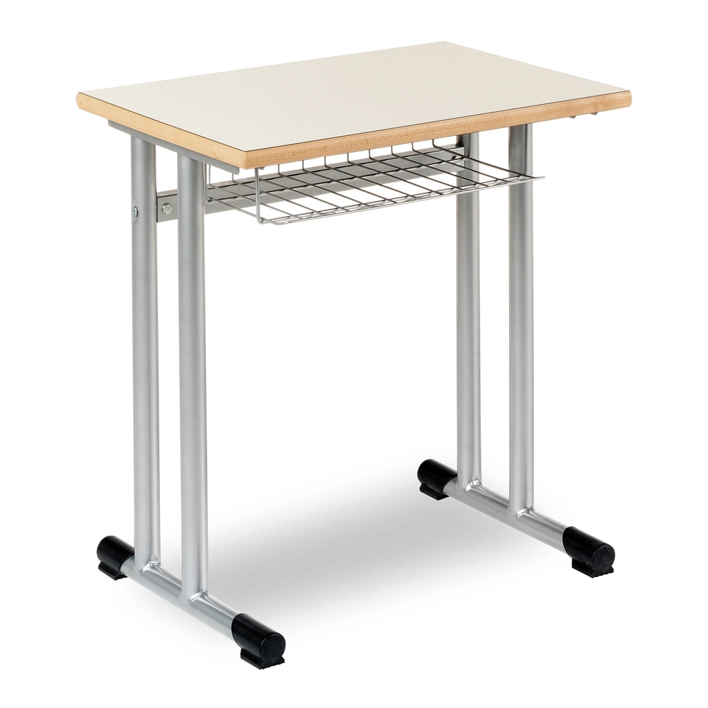 Struttura del tipo bicolonna realizzata in tubo acciaio diametro mm.40x1,5 di spessore, con barre perimetrali di collegamento in tubo da mm. 40x20x1,5, l'unione degli elementi avviene tramite 4 saldature a filo continuo su ogni montante. Piano in legno truciolare in classe E1 privo di formaldeide rivestito in laminato plastico spessore 9/10 su ambo i lati. Il bordo in faggio massello evaporato inserito sottolaminato verniciato e lucidato al naturale, spessore mm. 20. Piedini di appoggio in plastica alettata inestraibili ed antirumore. Verniciatura a polveri epossidiche previo sgrassaggio e fosfatazione cotte a forno a 200°C. Completo di sottopiano in griglia metallica con spondine di contenimento, avvitato sotto al piano.